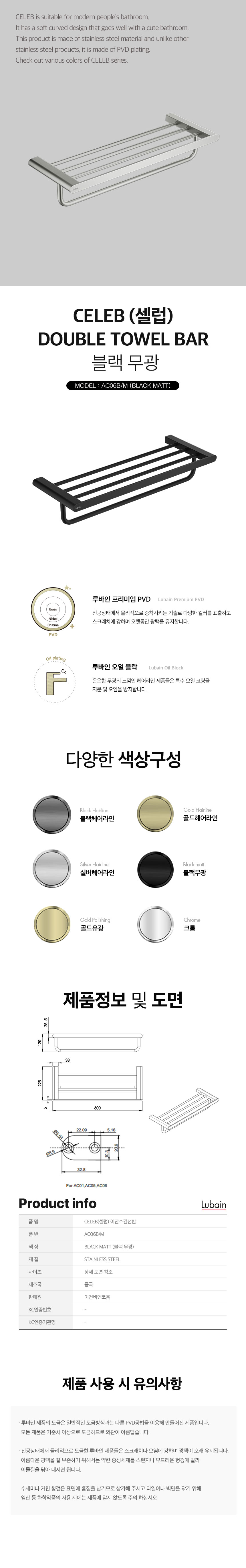 [루바인] 욕실 2단 수건선반 셀럽 AC06B/M 블랙 무광